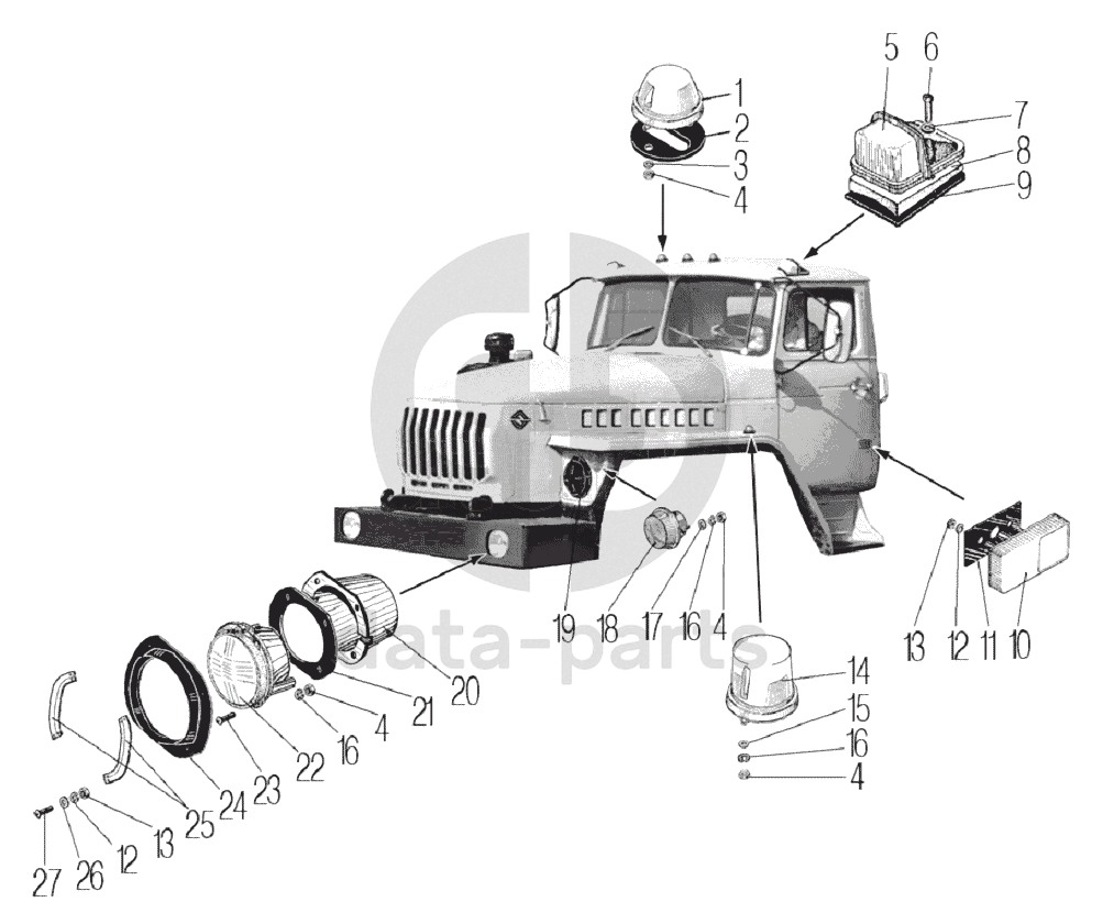 Установка фар, фонарей знака автопоезда, габаритных и указателей поворота УРАЛ-4320-1958-70И