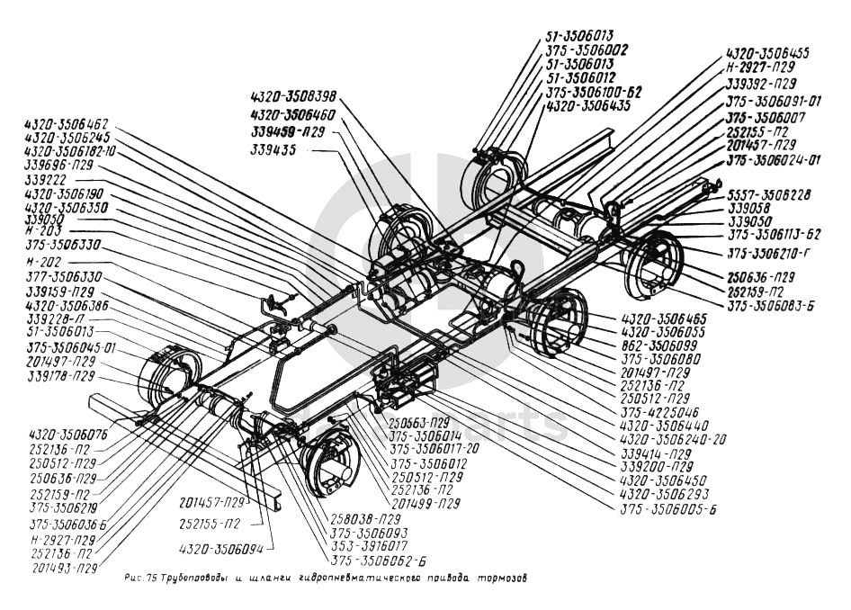 Трубопроводы и штанги гидропневматического привода тормозов УРАЛ-5557